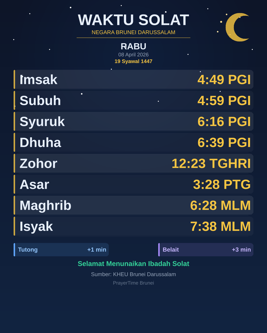 - Bacaan Harian — Kad bacaan harian memaparkan hadis, pengajaran, dan rujukan yang dijadualkan mengikut tarikh. Bacaan bertukar secara automatik setiap tengah malam waktu Brunei. Boleh dikongsi ke WhatsApp atau layari koleksi penuh di Bacaan Harian.