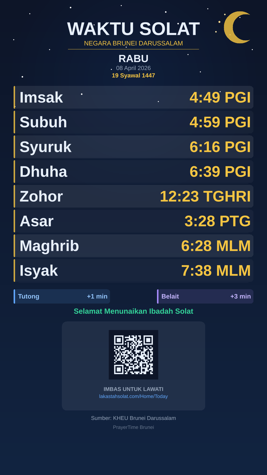 - Muat Turun & Kongsi — Tambah ke kalendar, muat turun gambar waktu solat dalam pelbagai format (Instagram WhatsApp), atau kongsi terus.